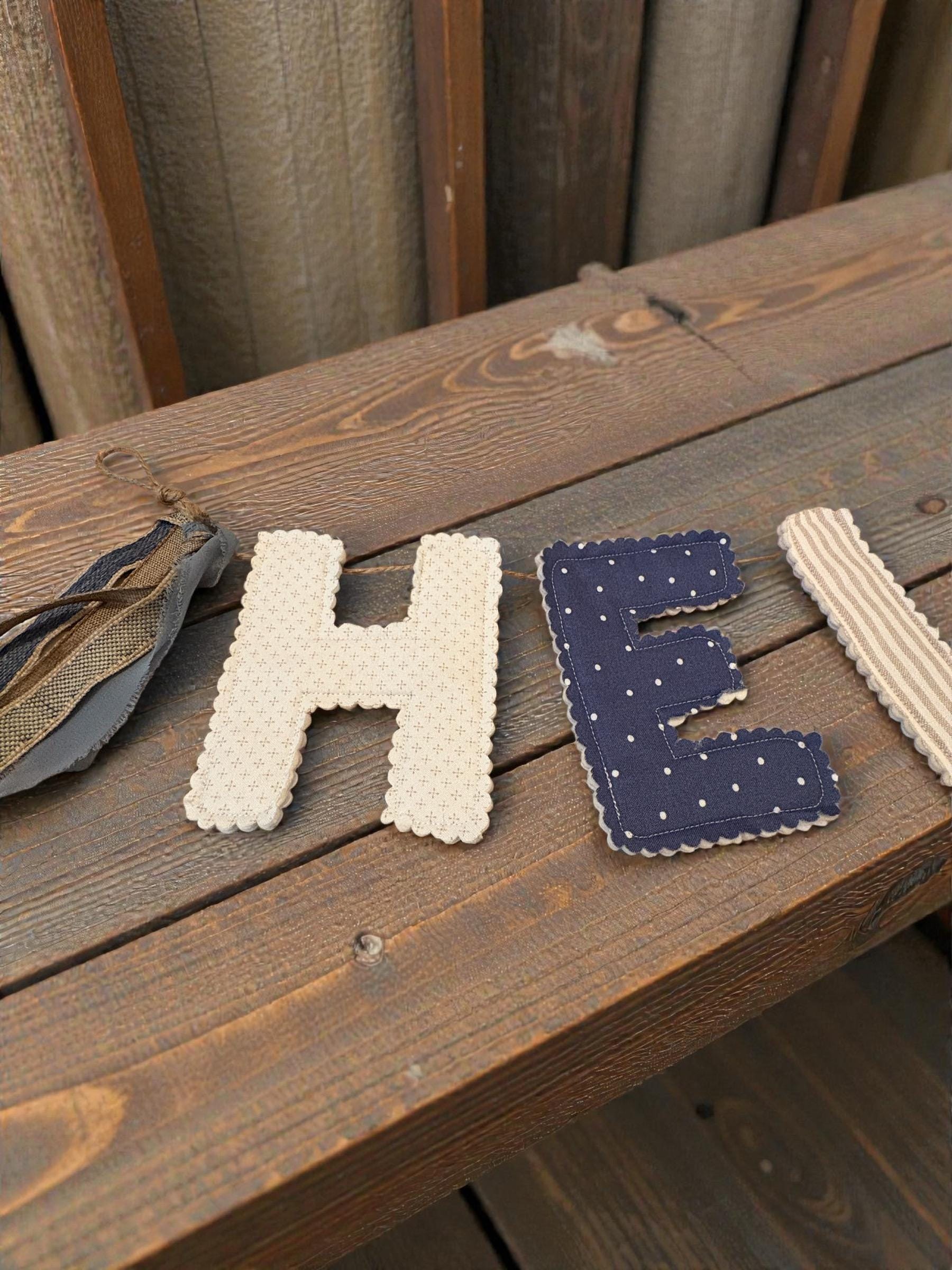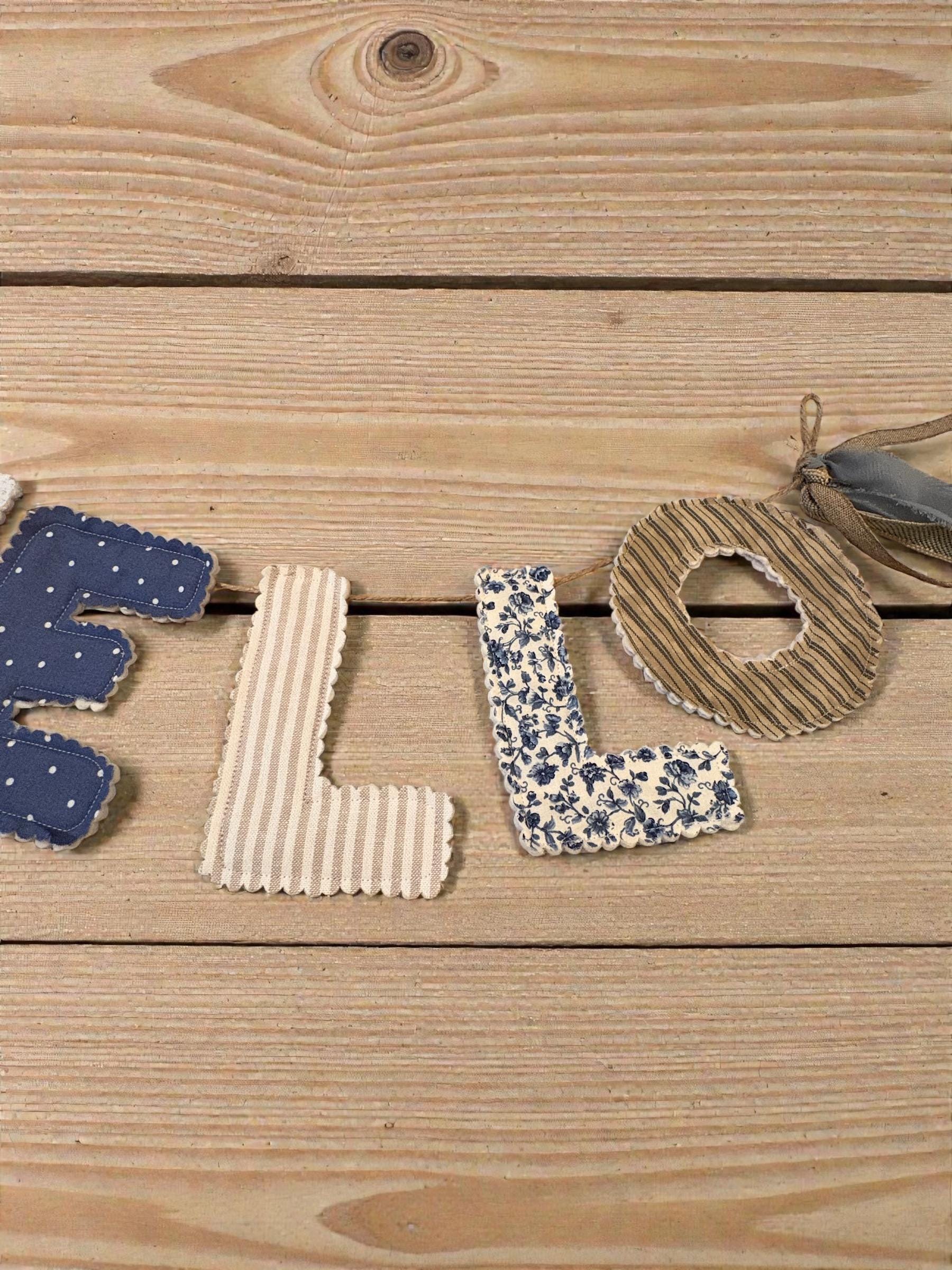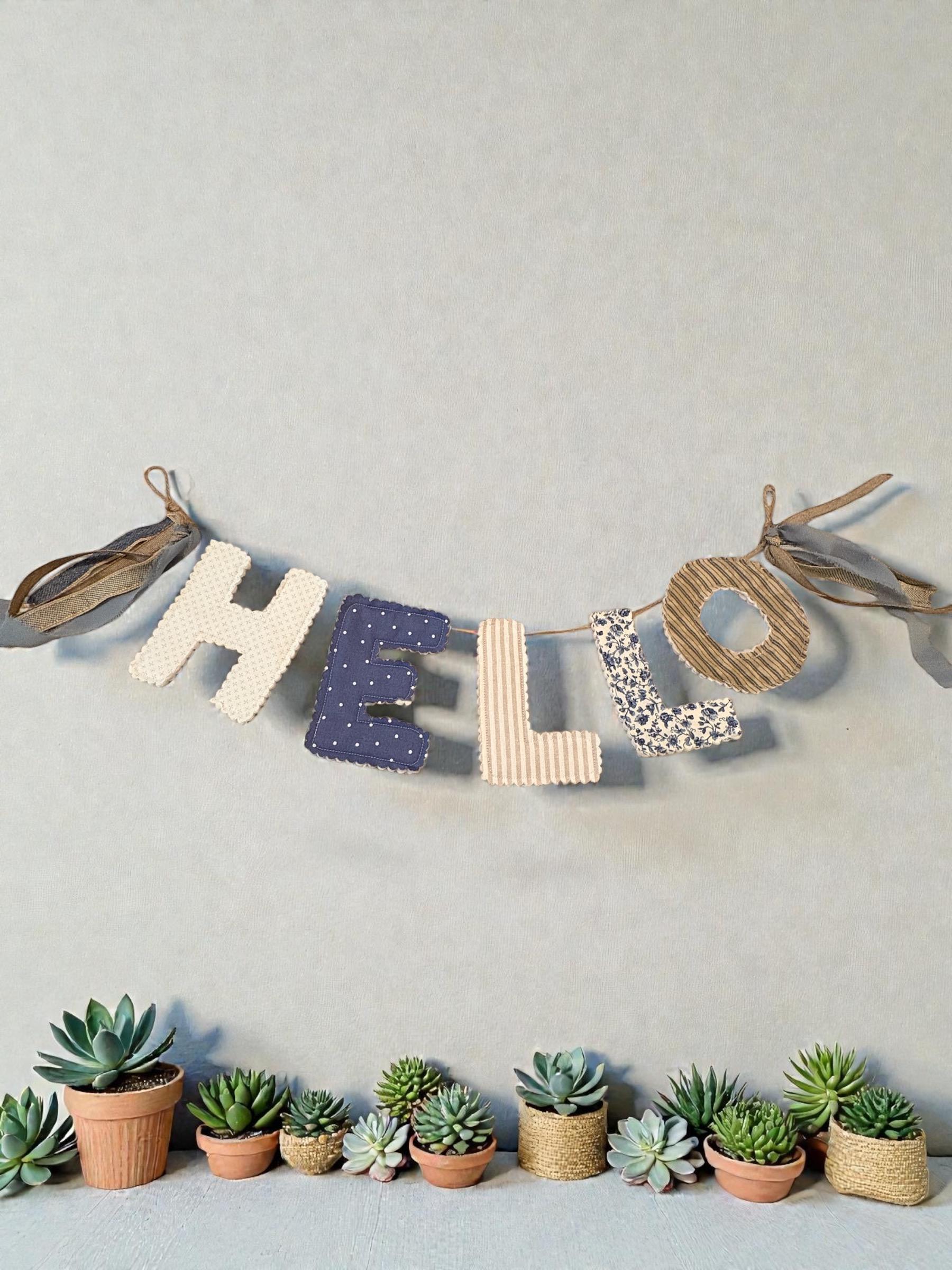 Add a soft, welcoming touch to your space with this handmade “hello” fabric letter garland in calming creams and blues. Each letter is carefully cut and backed for a clean, finished look, then strung together to create a charming piece of décor that feels cozy and timeless.